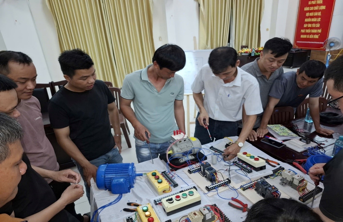 Điểm nhấn của khóa học là thời lượng thực hành chiếm phần lớn, tạo điều kiện để học viên biến lý thuyết thành kỹ năng. Tại các buổi học thực hành, các học viên được "mắt thấy, tay làm", từ việc đấu nối mạch điện, lắp đặt tủ điện điều khiển, cho đến xử lý các sự cố thường gặp. Chính nhờ việc tích cực thực hành này, người lao động không chỉ nắm vững lý thuyết mà còn có được kinh nghiệm thực tiễn quý báu, sẵn sàng áp dụng vào công việc hàng ngày.