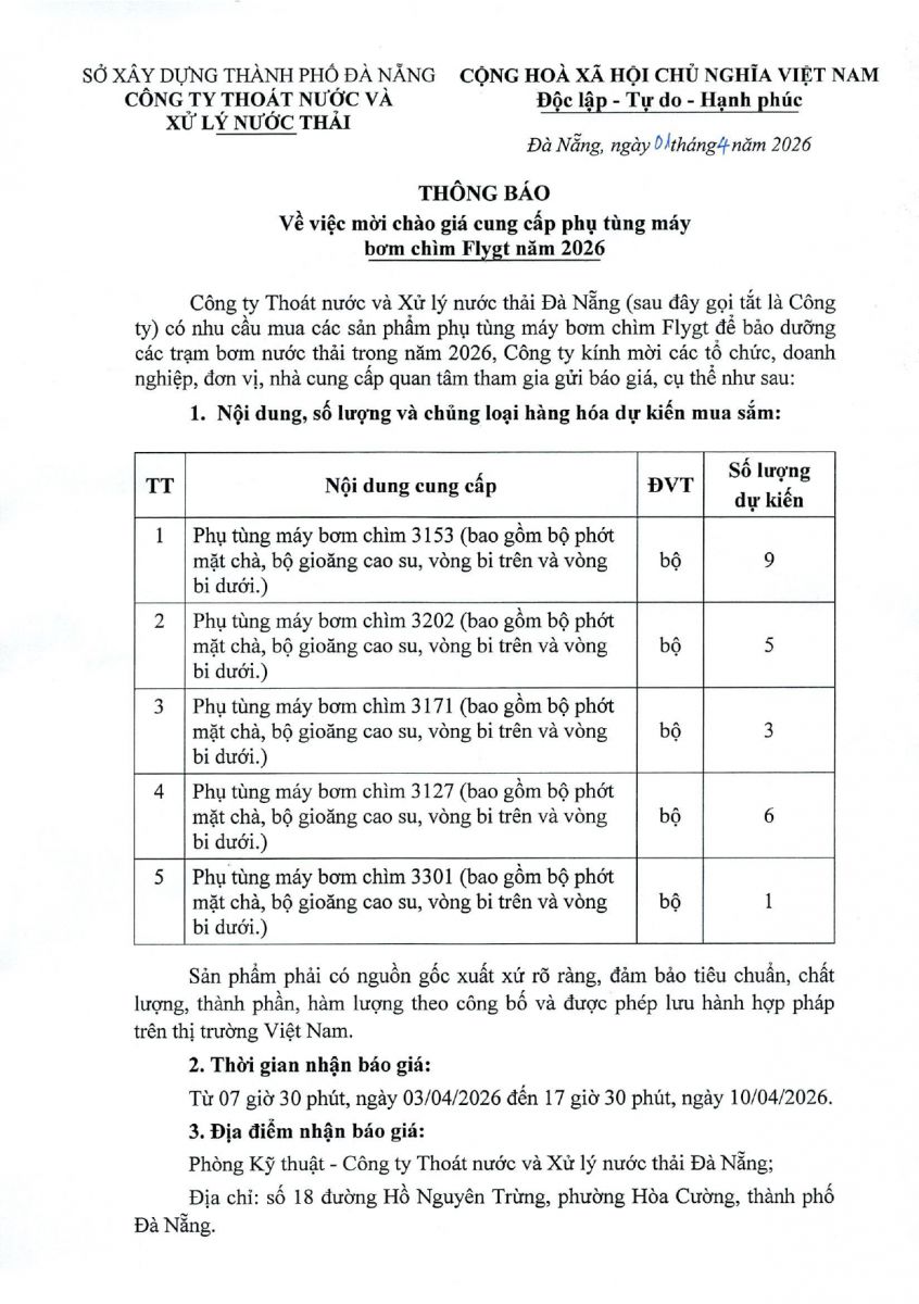 Thông báo chào mời giá cung cấp phụ tùng máy bơm chìm Flygt năm 2026